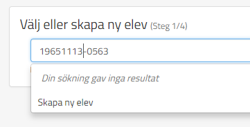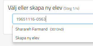 Vi vill först kontrollera att eleven inte finns i vårt system sedan tidigare - detta för att undvika att det skapas dubletter. Så vi börjar med att söka på elevens personnummer. Om det finns sedan tidigare så dyker eleven upp automatiskt: