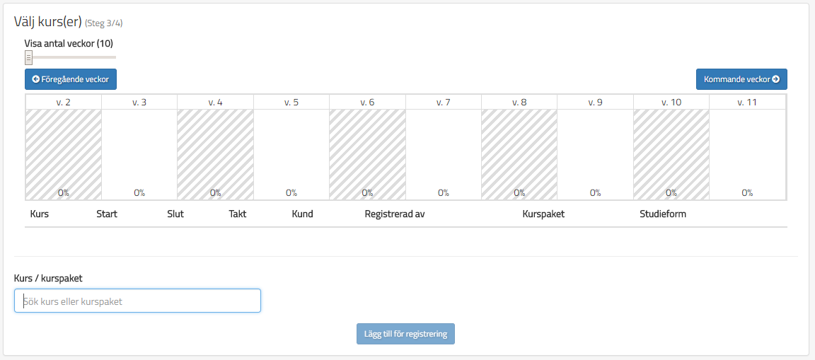 När ni har fyllt i och gjort era val så klickar ni på "Lägg till för registrering". Då kommer kursen fram i Gant-schemat och den listas även under schemat: