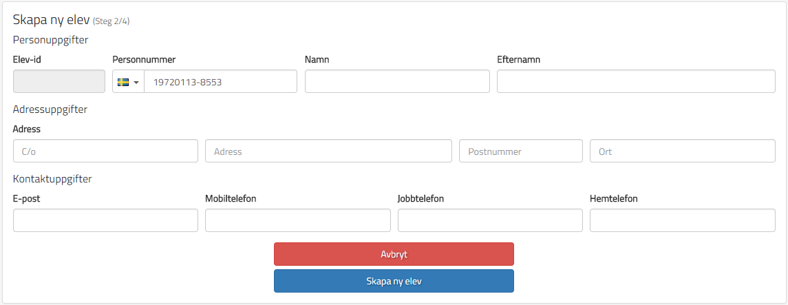 Nu börjar vi fylla i de personuppgifter som eleven har, det personnummer vi sökte på innan är redan inskrivet i rätt ruta: