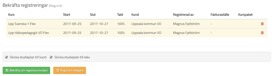Nu listas alla kurser och allmän info om dem och ni har valet att skicka en studieplan till kunden respektive eleven. Ni kan även då välja att Bekräfta och registrera kurserna eller Ångra och redigera kurserna ni valt: