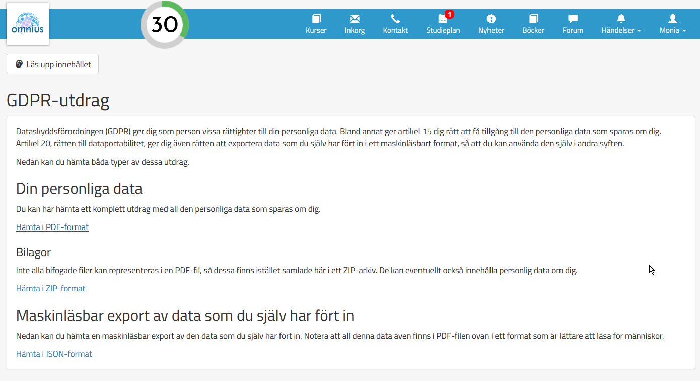Dataskyddsförordningen (GDPR) ger eleven som person vissa rättigheter till din personliga data. Bland annat ger artikel 15 eleven rätt att få tillgång till den personliga data som sparas om eleven. Artikel 20, rätten till dataportabilitet, ger eleven även rätten att exportera data som eleven själv har fört in i ett maskinläsbart format, så att eleven kan använda den själv i andra syften.