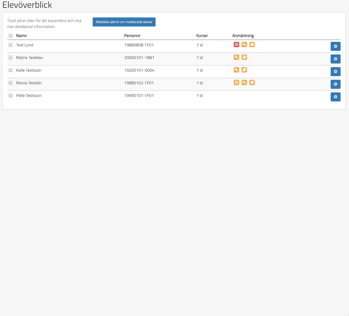 För att se mer information om t.ex. eleven Pelle så klickar man på den raden och då kommer hans kurser upp.
