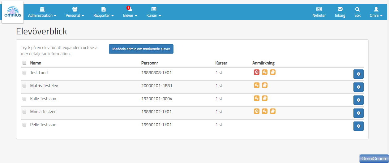 Här listas alla elever som är kopplade till den kommun du som användare är ansluten till.