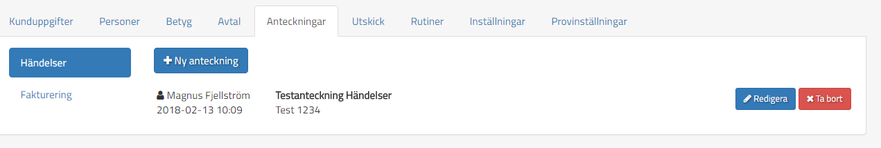 Under Anteckningar så kan man lägga till 2 typer av anteckningar: Händelser och Fakturering.