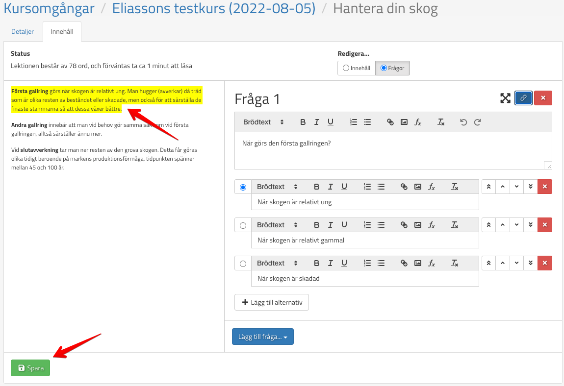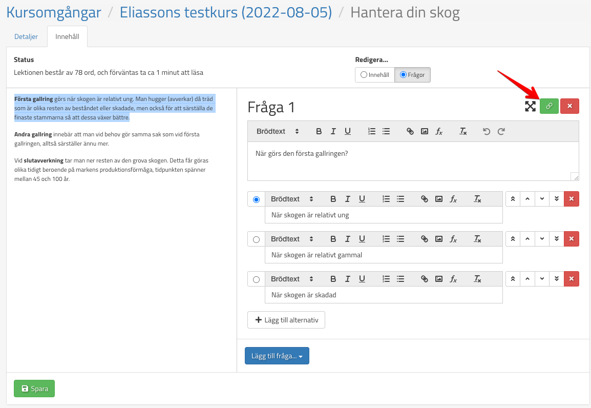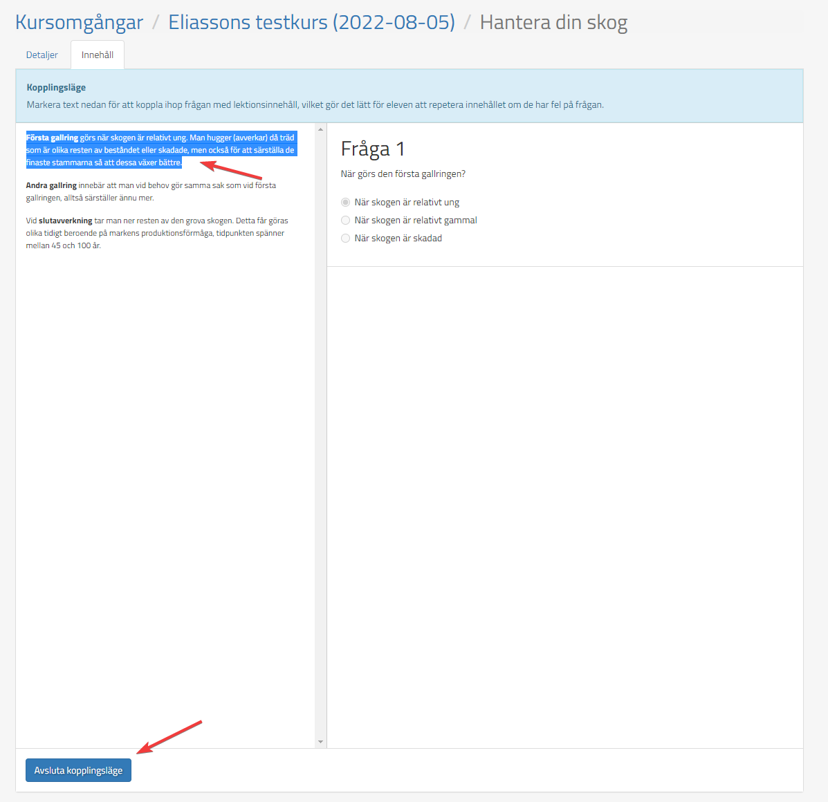 Därefter klickar du på "Koppla till lektionsinnehåll" en gång till för att knyta den markerade texten till frågan.