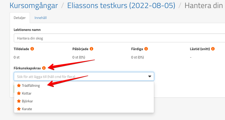Om du ställer in att lektionen Hantera din skog har förkunskapskrav: Trädfällning, så kommer de studerande inte kunna öppna lektionen förrän de är godkända på Trädfällning.