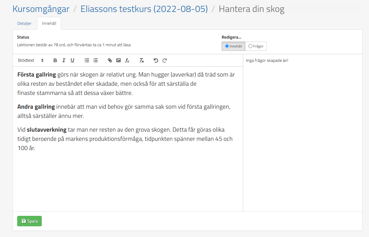 När du skapat en lektion får du först fylla på med innehåll, alltså den information de studerande ska ta till sig.