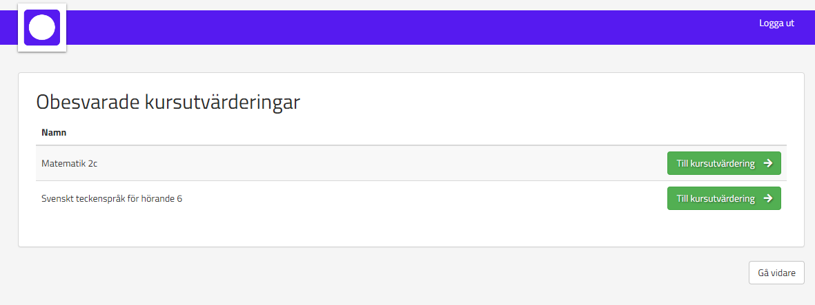 Om en studerande inte har gjort sin kursutvärdering dagen efter kursslut så kommer de att mötas av splashen nedan när de loggar in i systemet. Splashen försvinner när de har gjort kursutvärderingen eller när tre veckor har passerat. Om den studerande inte önskar göra kursutvärderingen trycker de på Gå vidare
