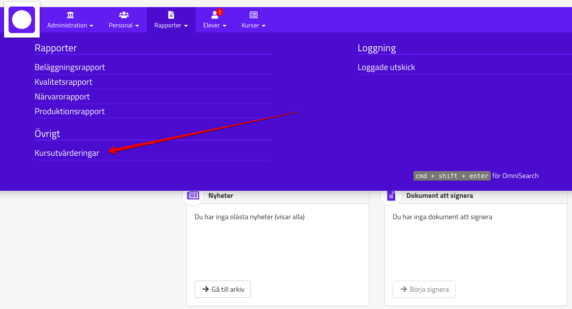 Utbildare och utbildningsledare hittar resultaten från kursutvärderingen via ikonen Rapporter och Kursutvärderingar