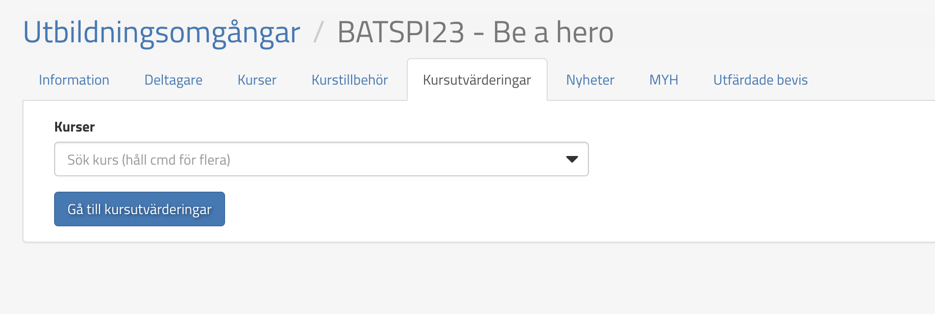 Utbildningsledaren kan hämta kursutvärderingen i modulen Utbildningsomgångar under fliken kursutvärderingar: