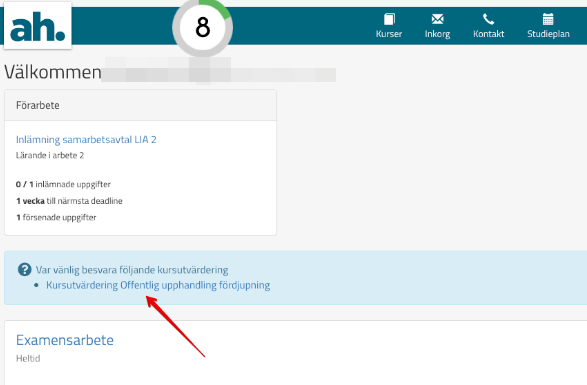 Om de studerande har en kursutvärdering att göra så visas den högt upp på deras sida: