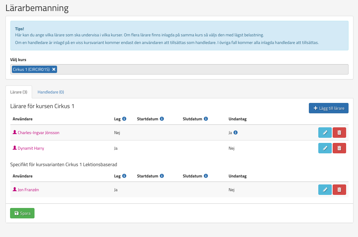 När det är gjort går ni in i modulen lärarbemanning och väljer kurs samt lägger till önskad lärare.