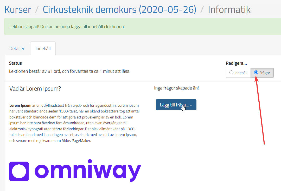 För att skapa frågor till texten så väljer ni Frågor och Lägg till fråga: