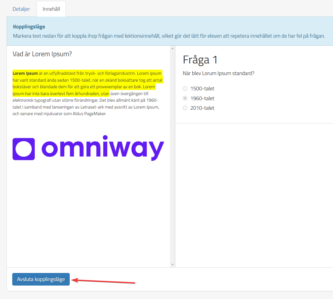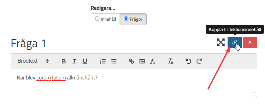 För att koppla Frågan till texten så välj kopplingssymbolen: