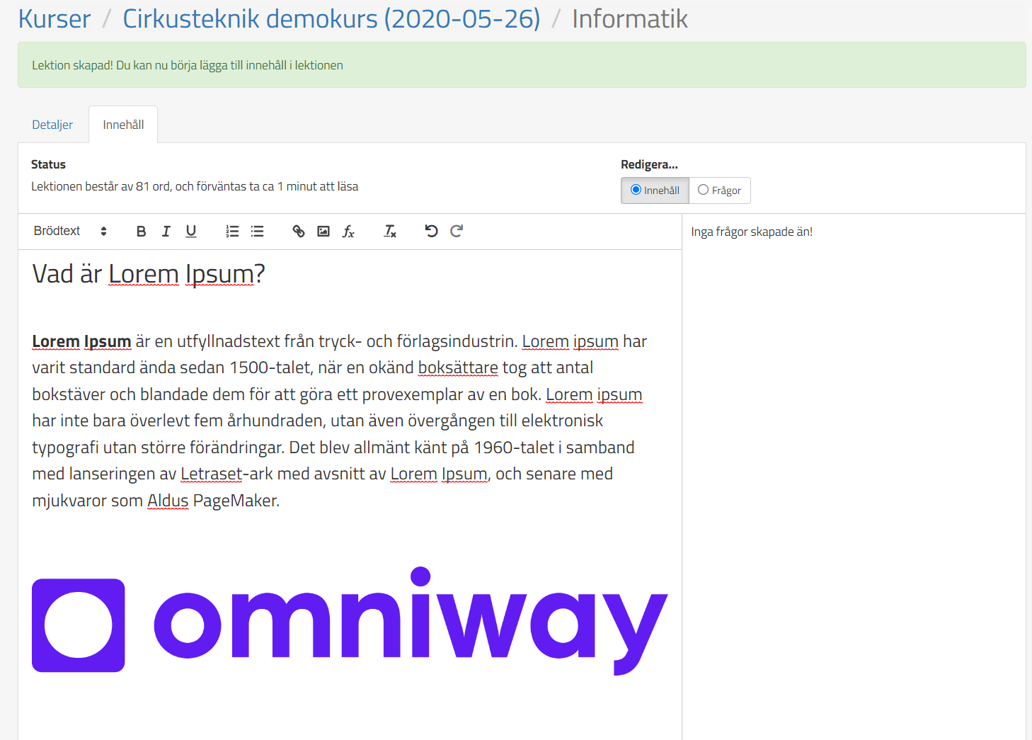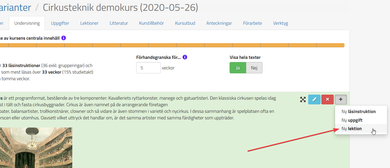 För att skapa en lektion så går ni till önskad kurs, väljer fliken Lektioner och trycker på Skapa ny lektion. När ni gett lektionen ett namn så kan ni börja lägga in innehåll, t.ex text och bild.
