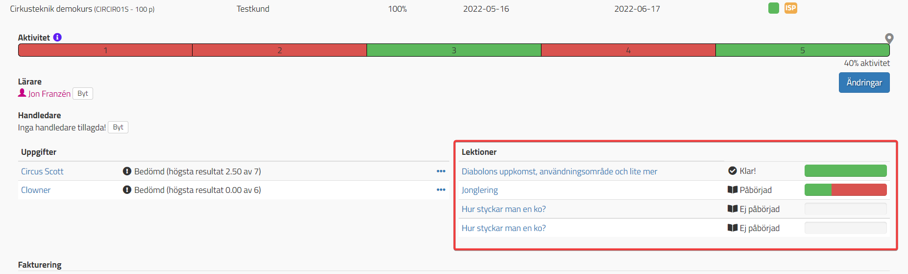 På elevens sida får ni en överblick över hur det har gått på lektionerna. Alla frågor på lektionen måste vara besvarade rätt för att lektionen ska bli klar(helt grön).