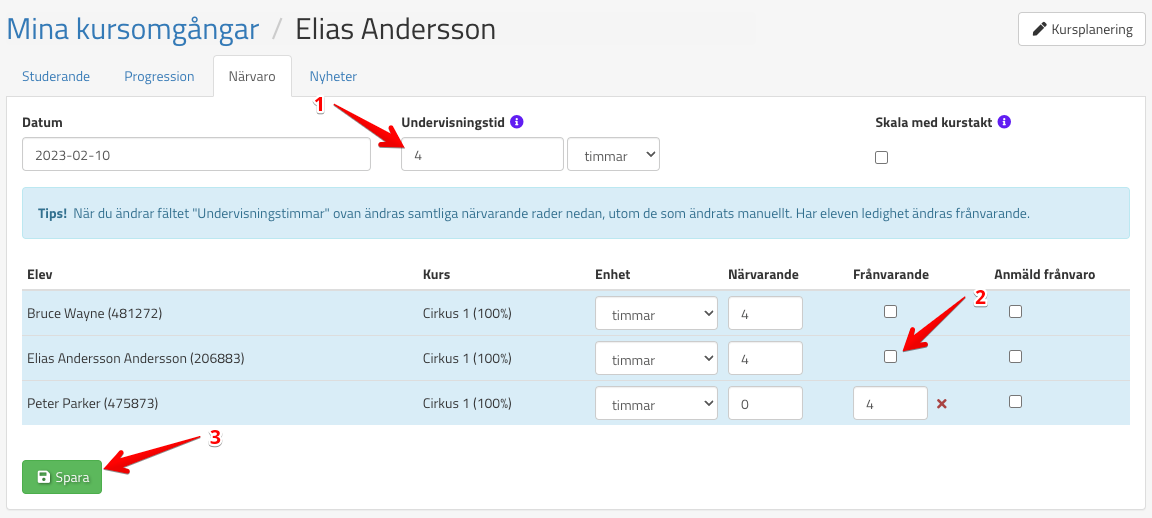 Därefter klickar ni för (2) de som är frånvarande. (Om de endast delvis frånvarande kan ni ange hur många timmar der var närvarande.)