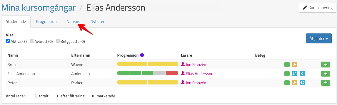 För att registrera Närvaro går ni in på den aktuella kursomgången så ser ni fliken Närvaro här: