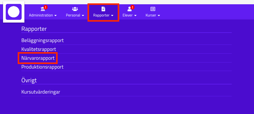 Med rollen skolledare (utbildningsledare) går det att dra ut närvarorapporter. Tryck på ikonen Rapporter och välj Närvarorapport. Om du är utbildare så behöver du kontakta din utbildningsledare för att få en sammanställning.