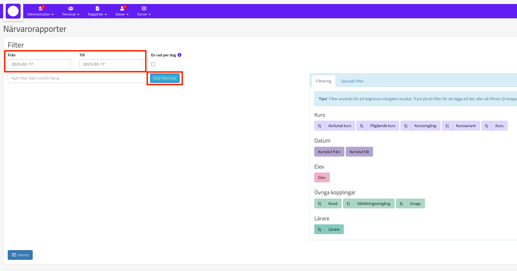 Där kan ni dels välja vilket tidsintervall ni vill se, dels ange vilka filter ni vill använda. Förslagsvis så lägger ni till den kursomgång eller utbildningsomgång som det gäller. Tryck sedan på Hämta.