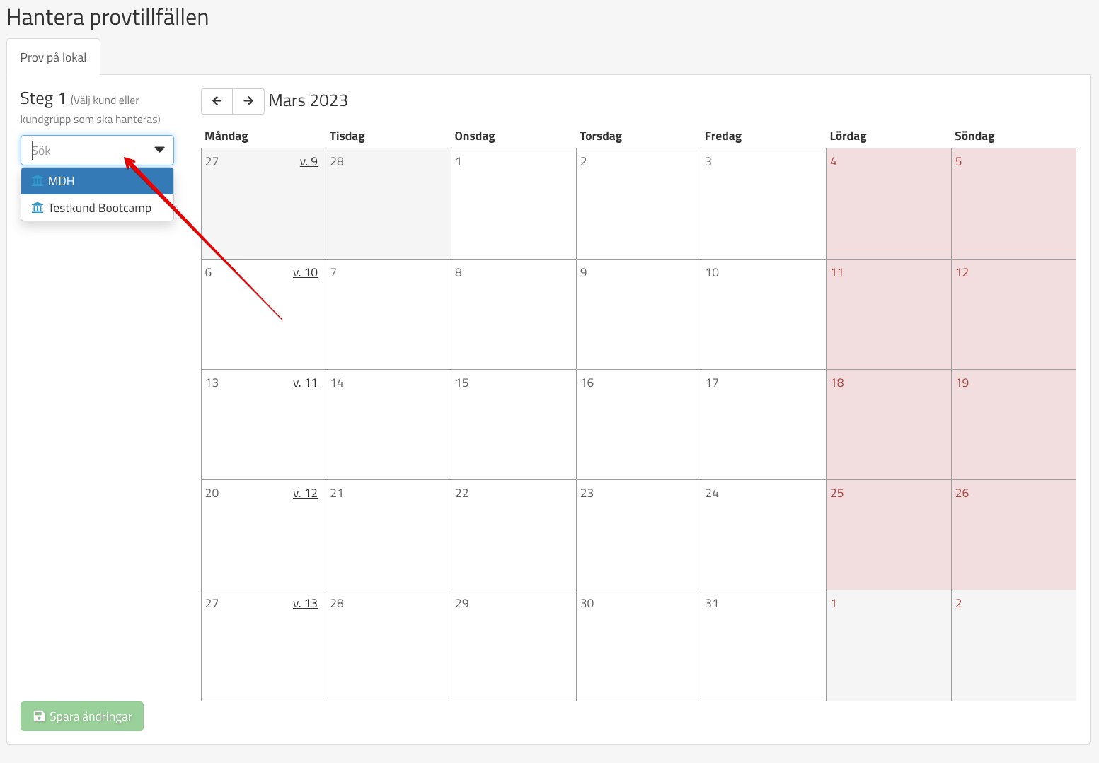 Under ikonen Administrationen och modulen Provtillfällen så styr användaren via en kalendervy när prov på lokal ska ske.