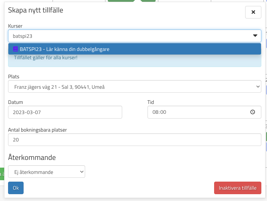 Då kan jag sedan göra mina inställningar för detta provtillfälle. Sök rätt på vilken kursomgång, välj plats(lokal) och resterande inställningar och tryck på Ok: