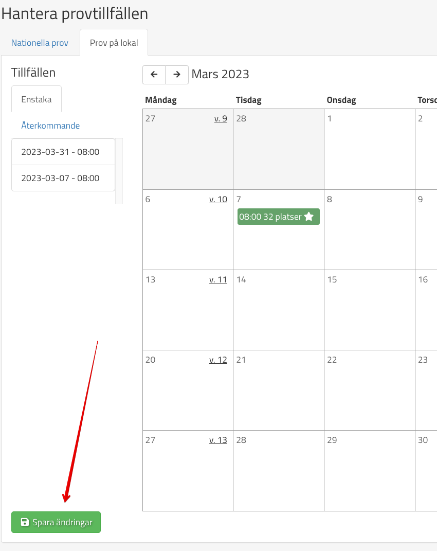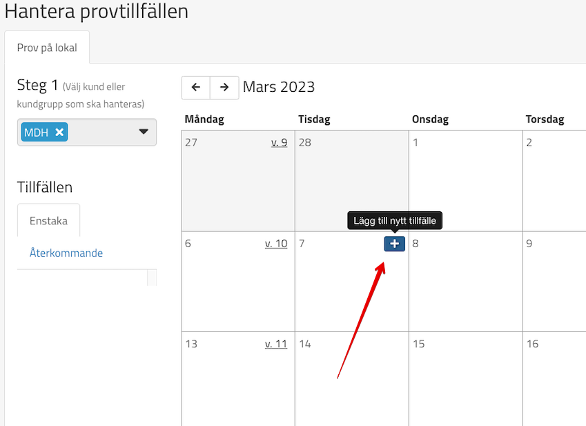 Under "Enstaka" så ligger de enstaka tillfälle som finns planerade. Med enstaka så menas att man planerar ett enda enskilt provtillfälle. Välj detta alternativ.