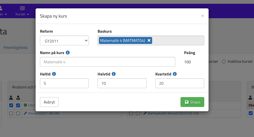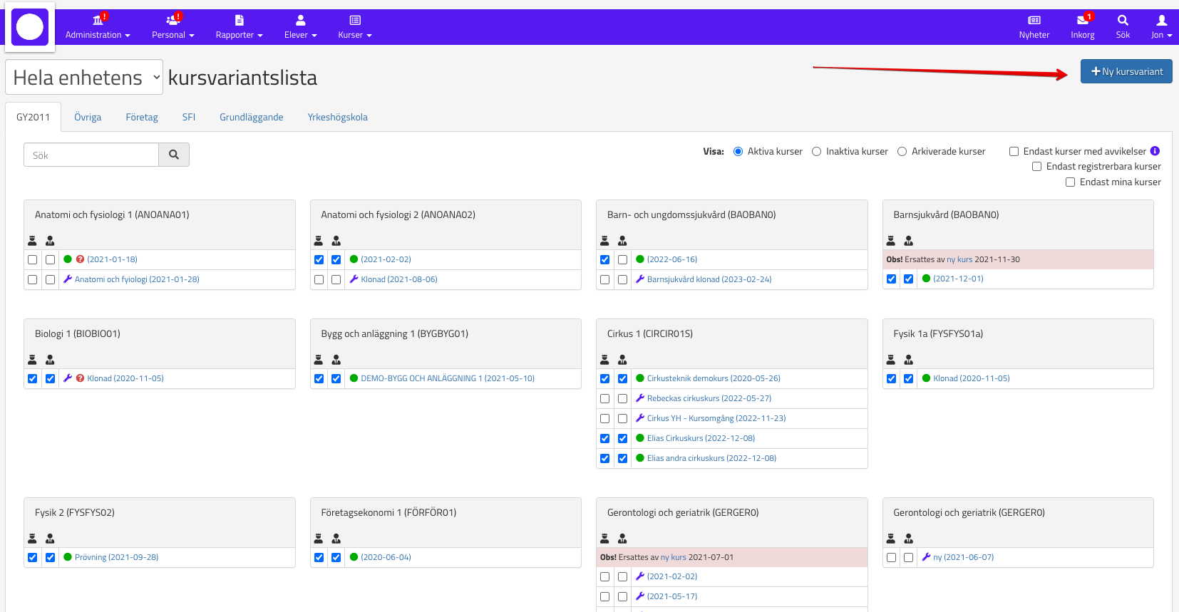 För att skapa en ny kurs går ni till modulen Kursvariantslista och trycker på Ny kursvariant: