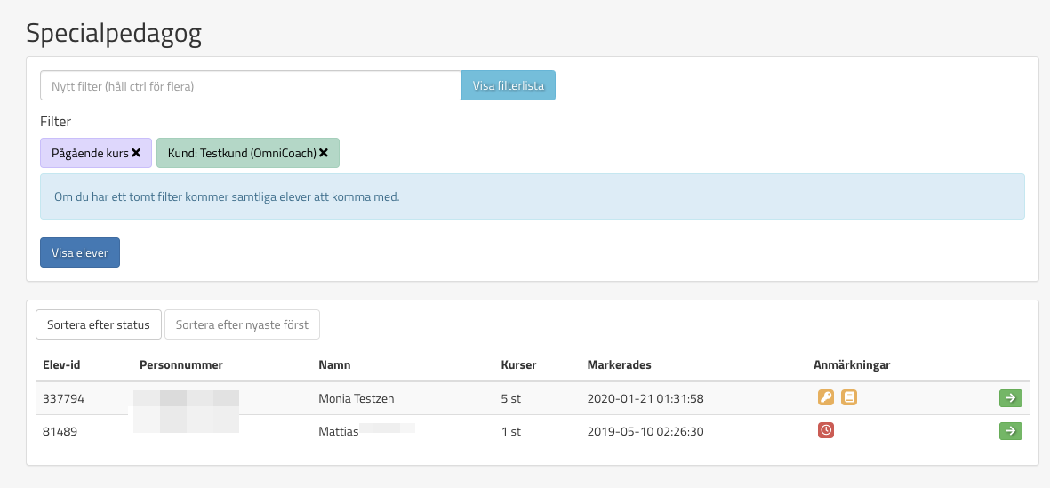 Om en användare har rollen specialpedagog så får den tillgång till modulen Specialpedagog. I den modulen samlas alla elever som har markerats som att de har behov av anpassning (livbojade elever).