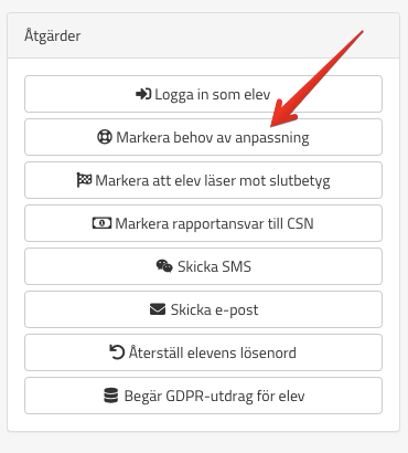 Rollen Specialpedagog kan markera att elever har behov av anpassning på elevkortet: