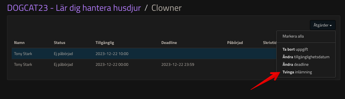 Om ni har en uppgift som ni av någon anledning vill lämna in åt de studerande kan ni välja funktionen Tvinga inlämning.
